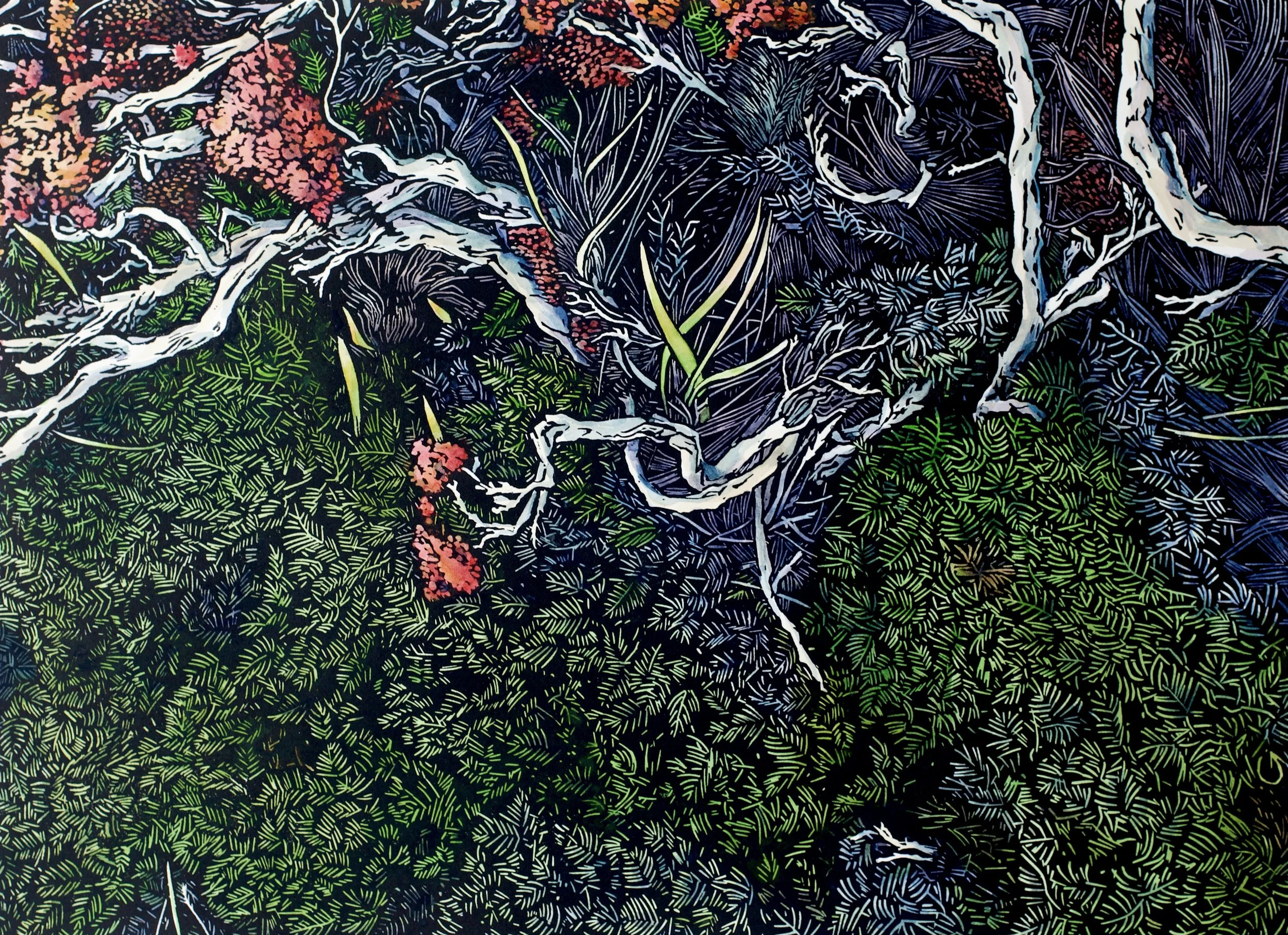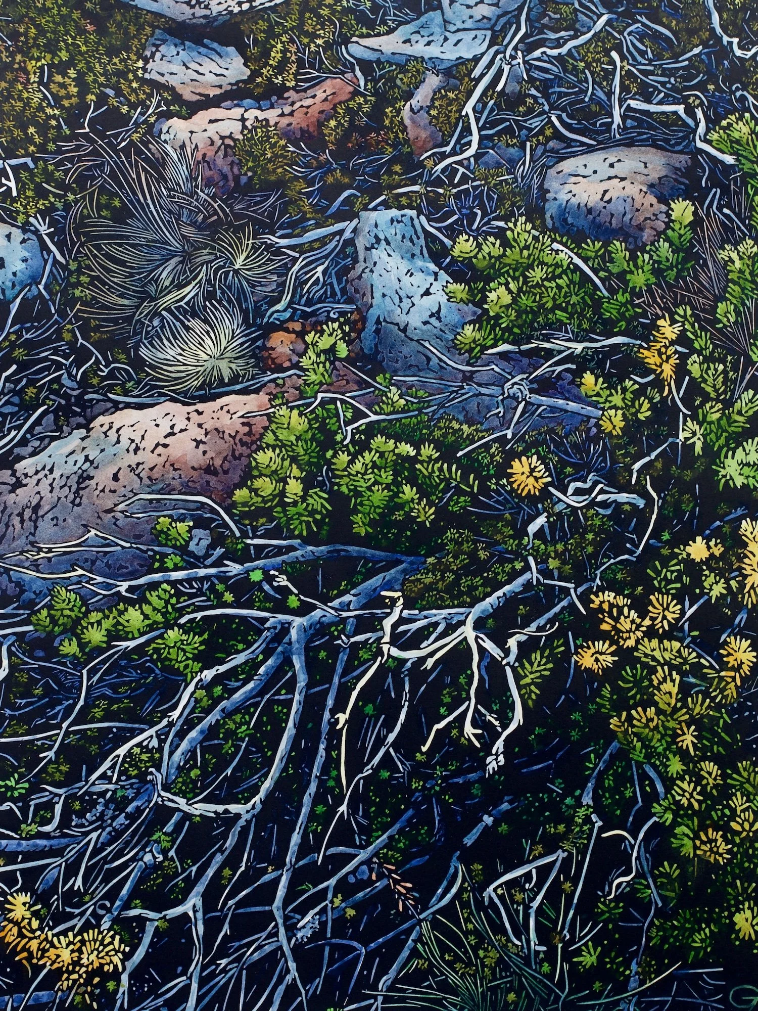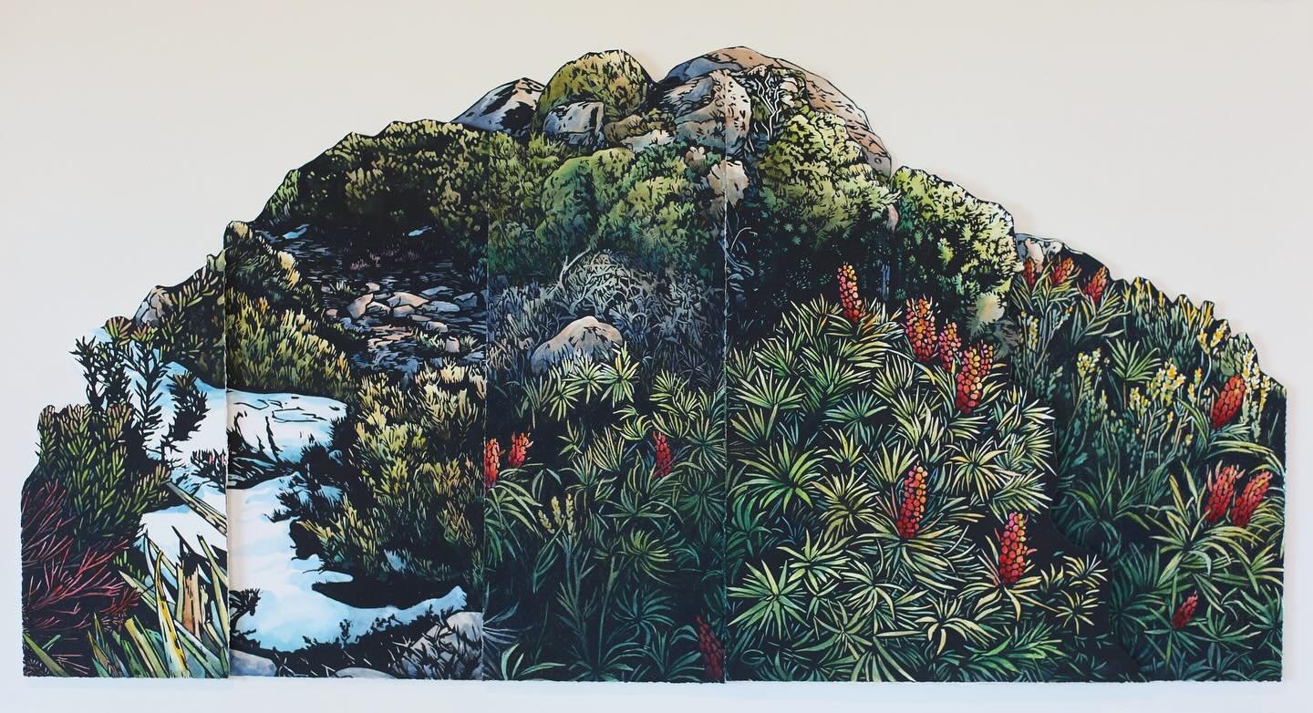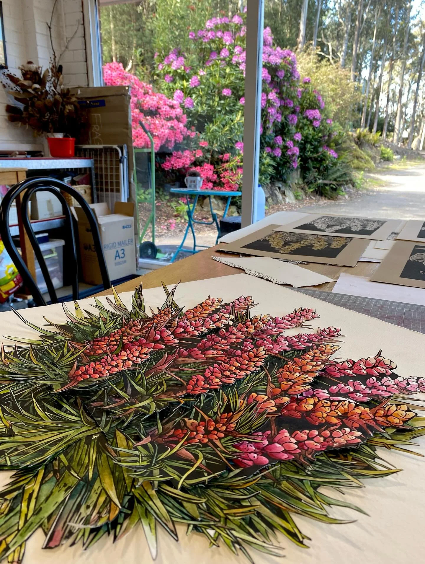 I’m an artist living and working in the foothills of Kunanyi in Lutruwita/Tasmania. I create hand painted relief prints that explore the landscape and my place in it.