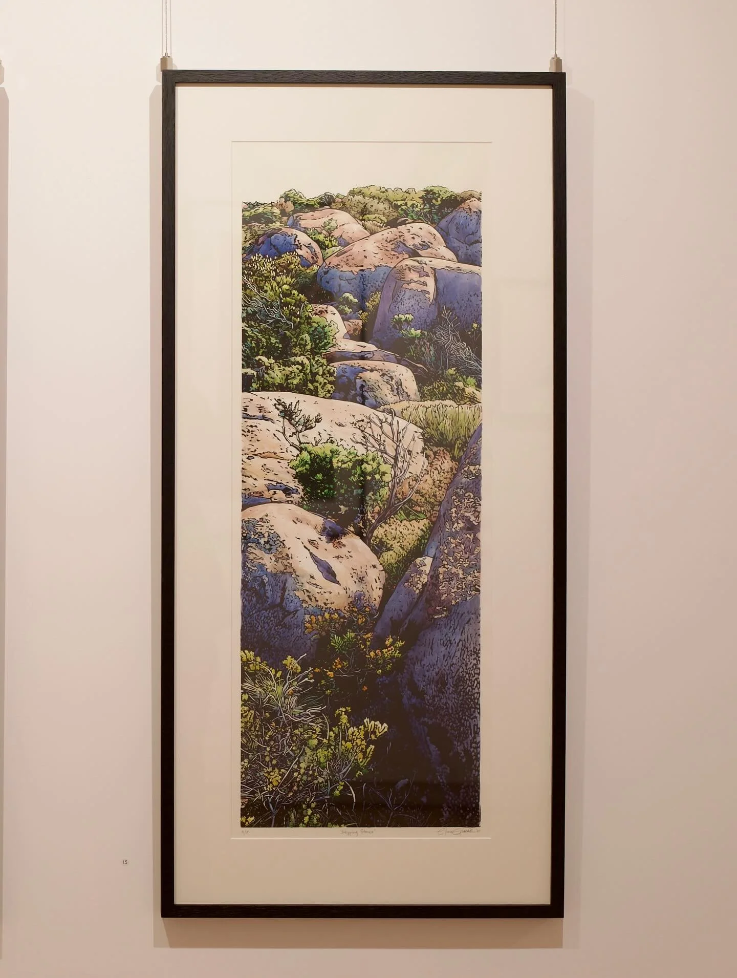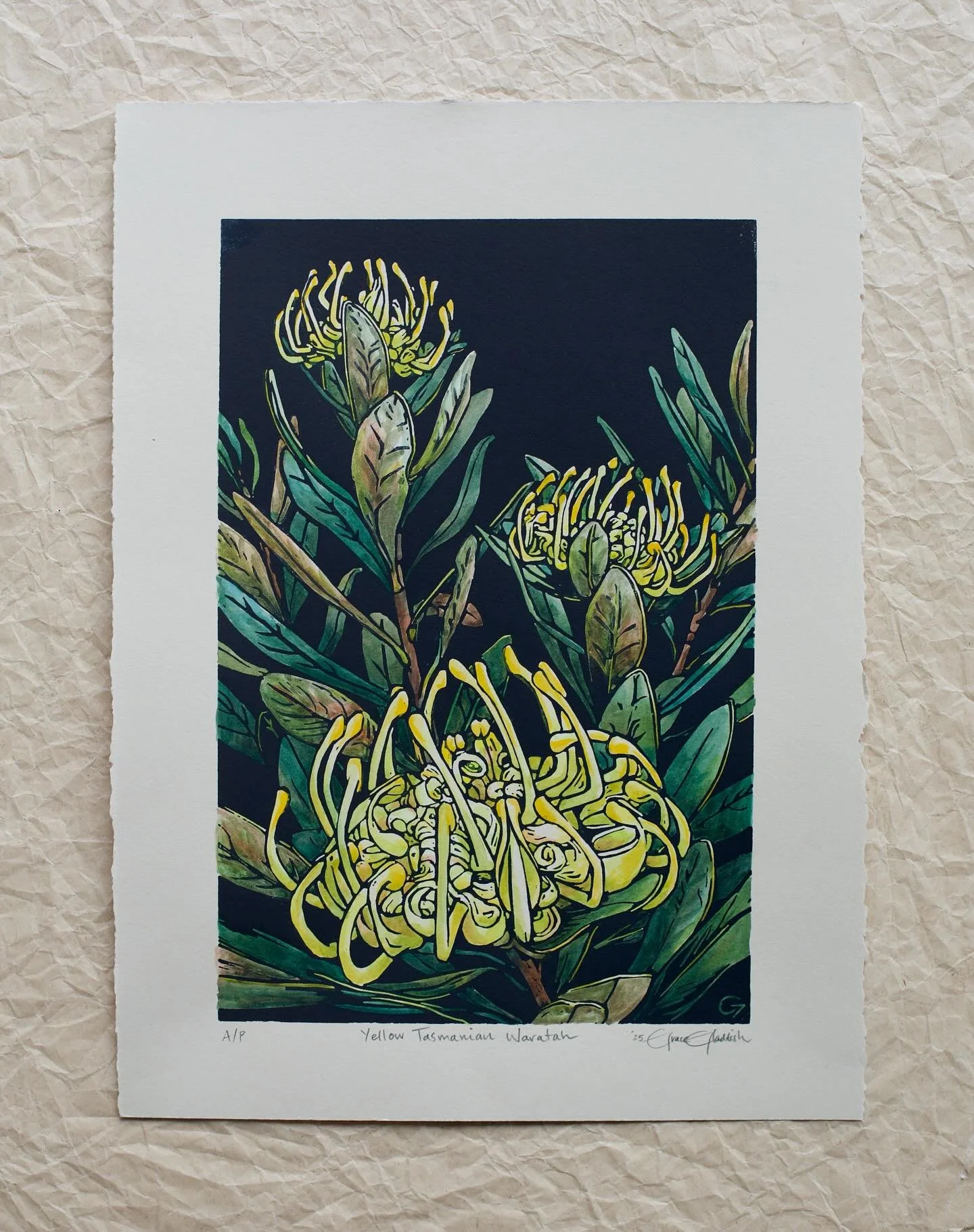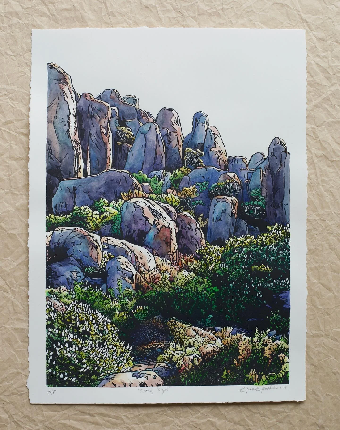 I’m an artist living and working in the foothills of Kunanyi in Lutruwita/Tasmania. I create hand painted relief prints that explore the landscape and my place in it.