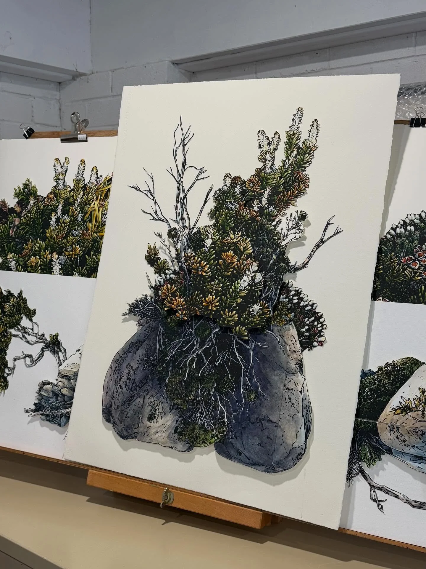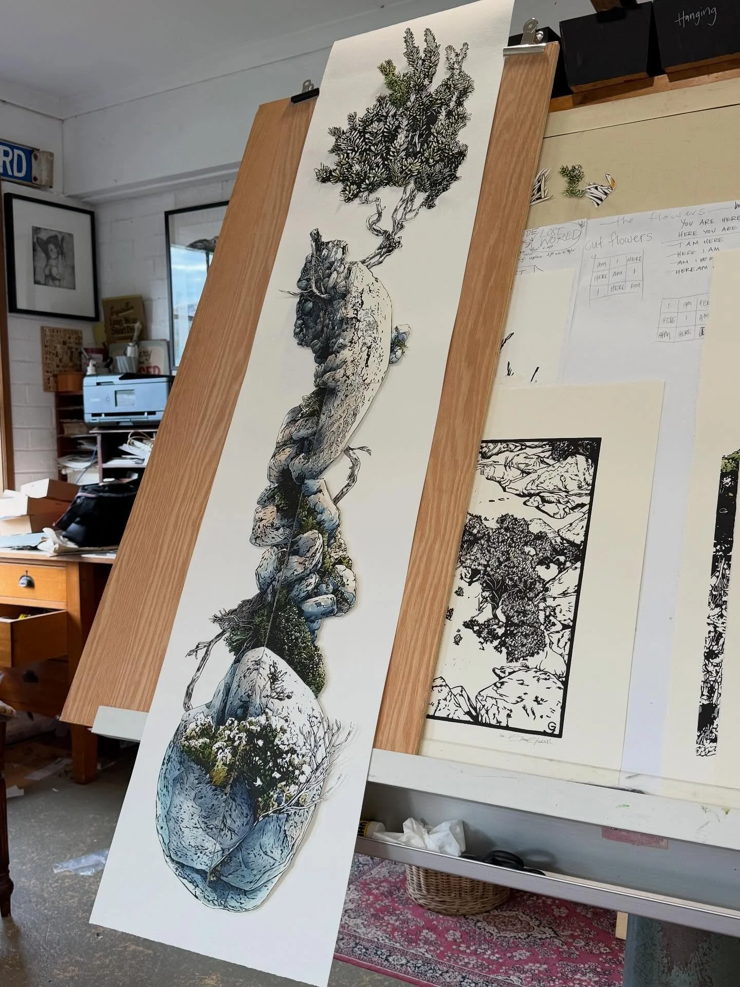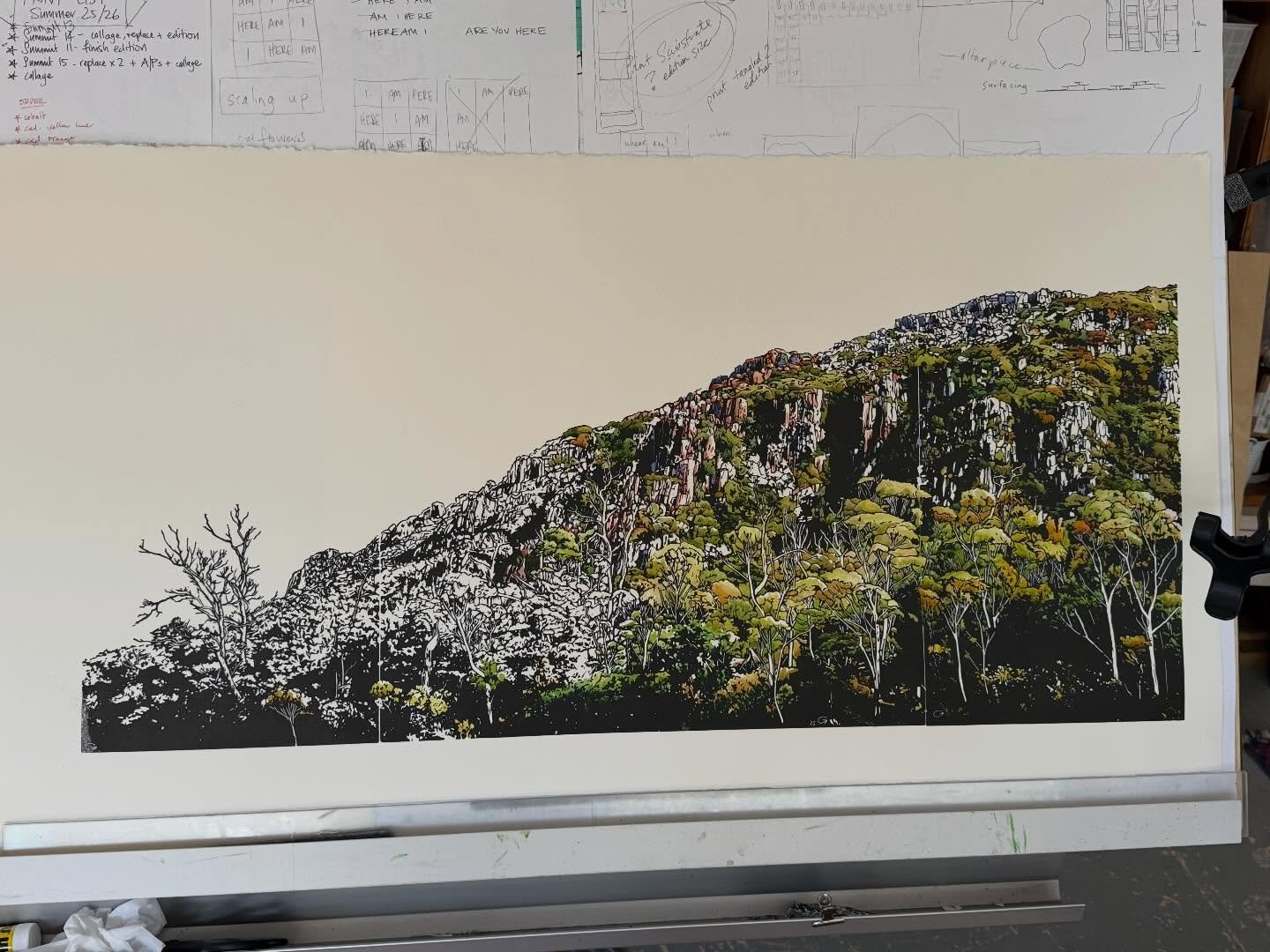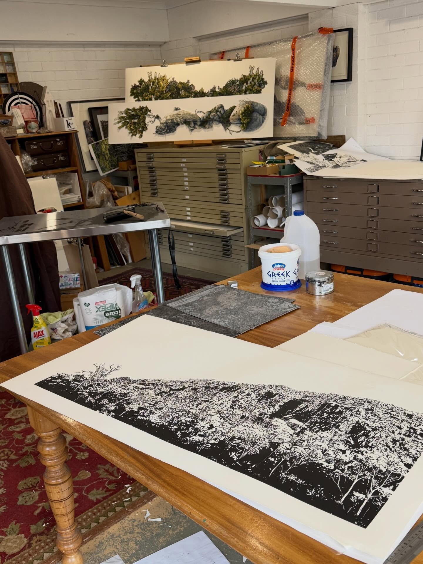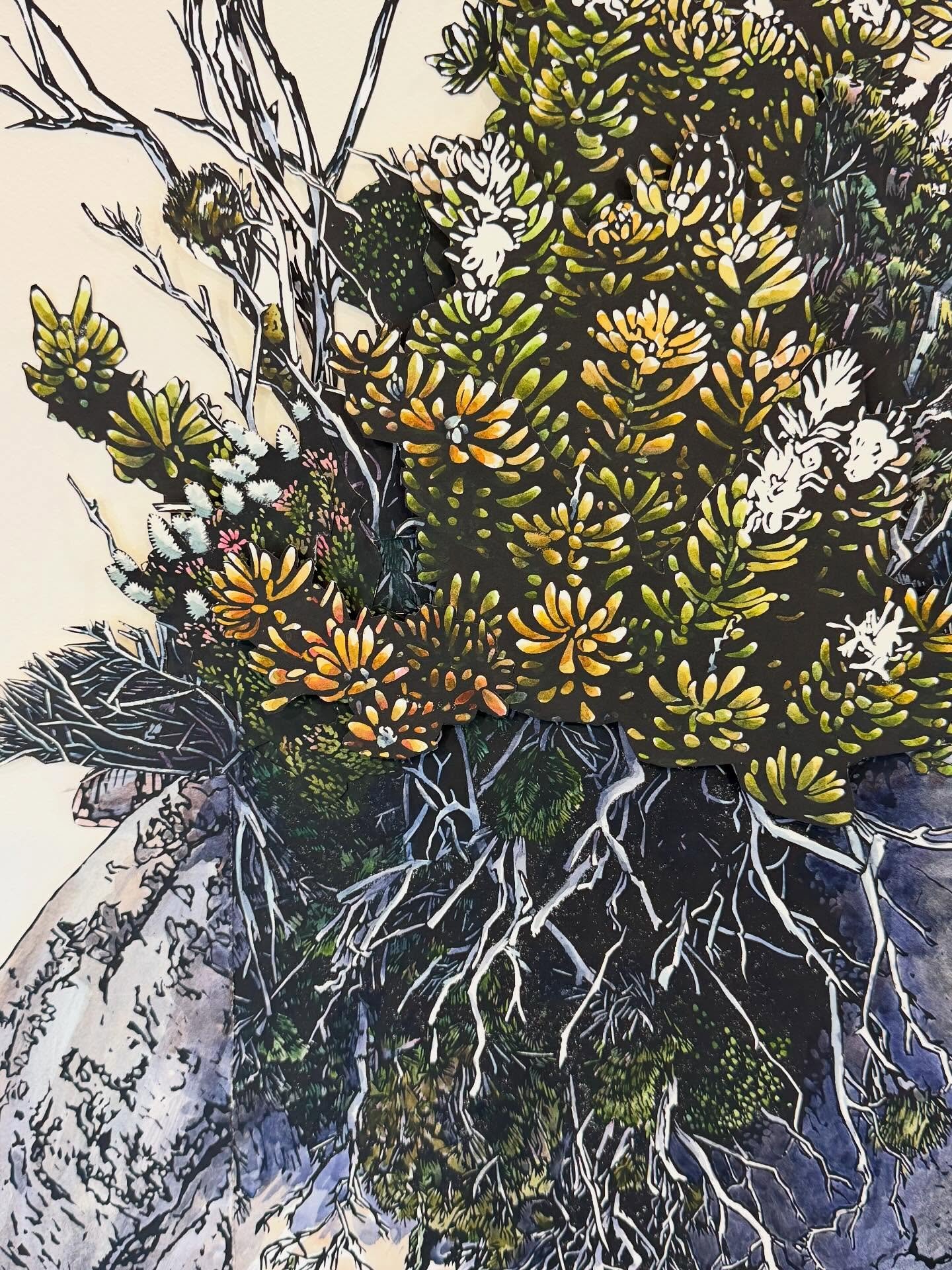 Iām an artist living and working in the foothills of Kunanyi in Lutruwita/Tasmania. I work with linocut, watercolour and collage to explore the landscape and my place in it.