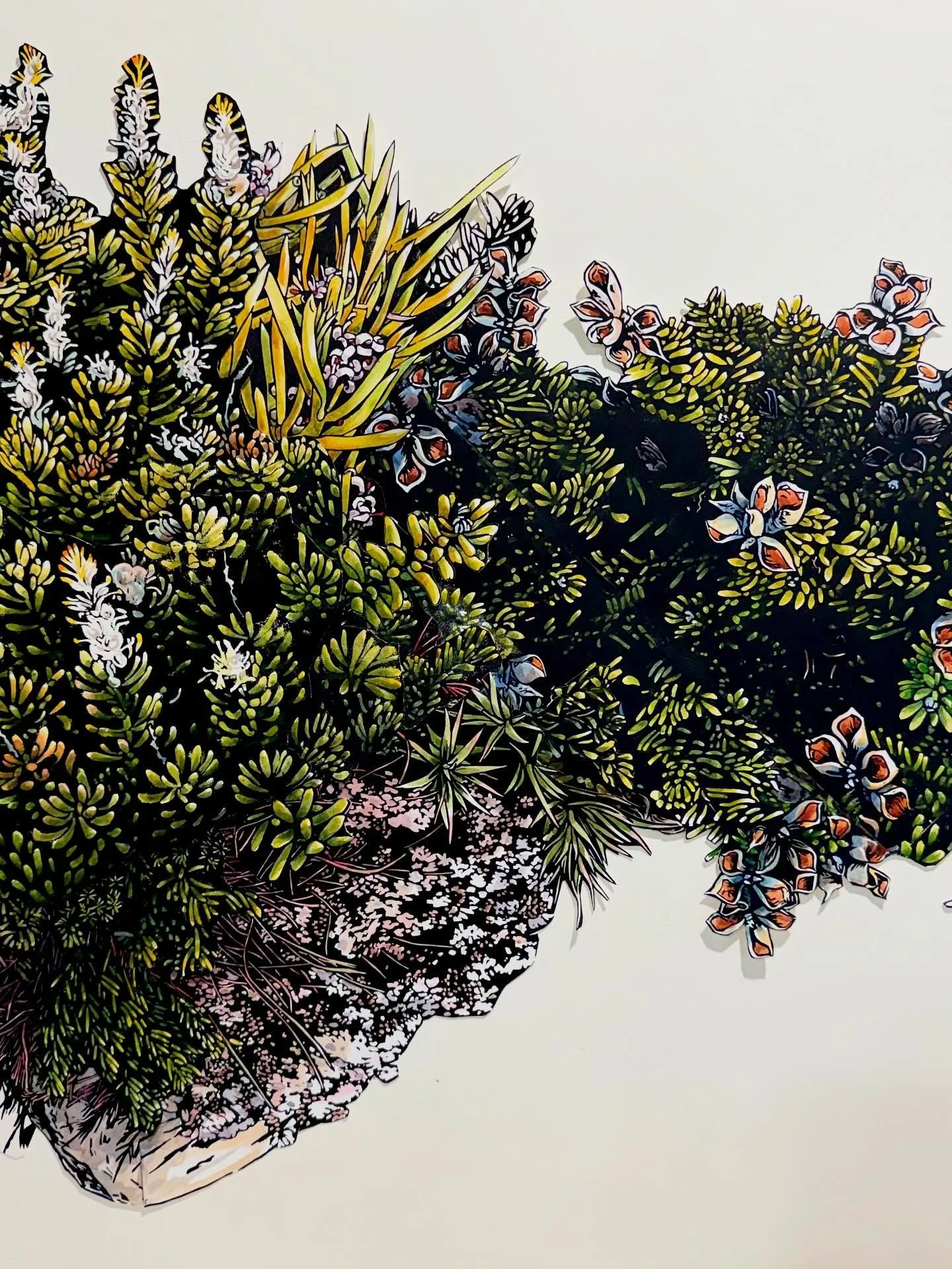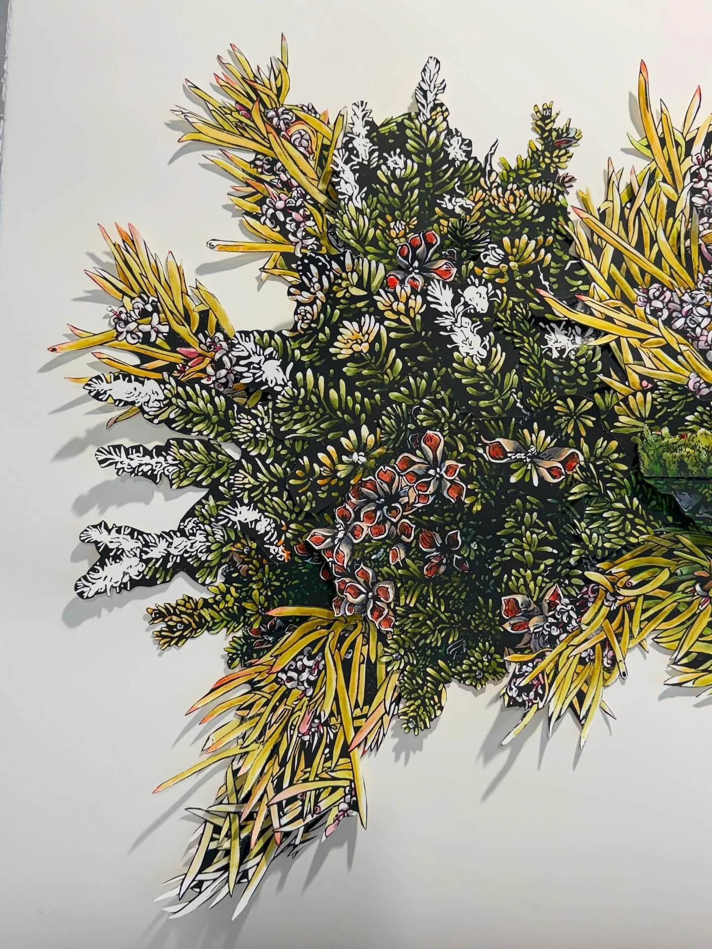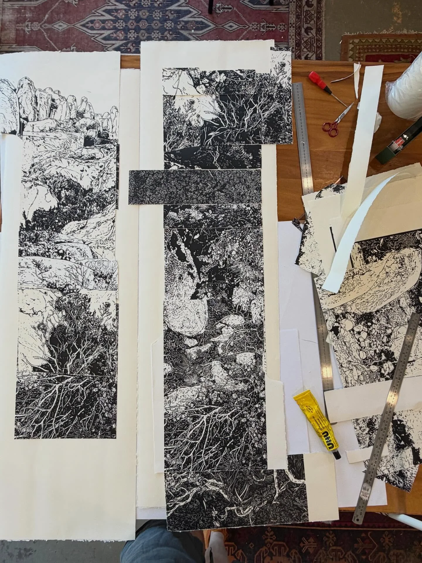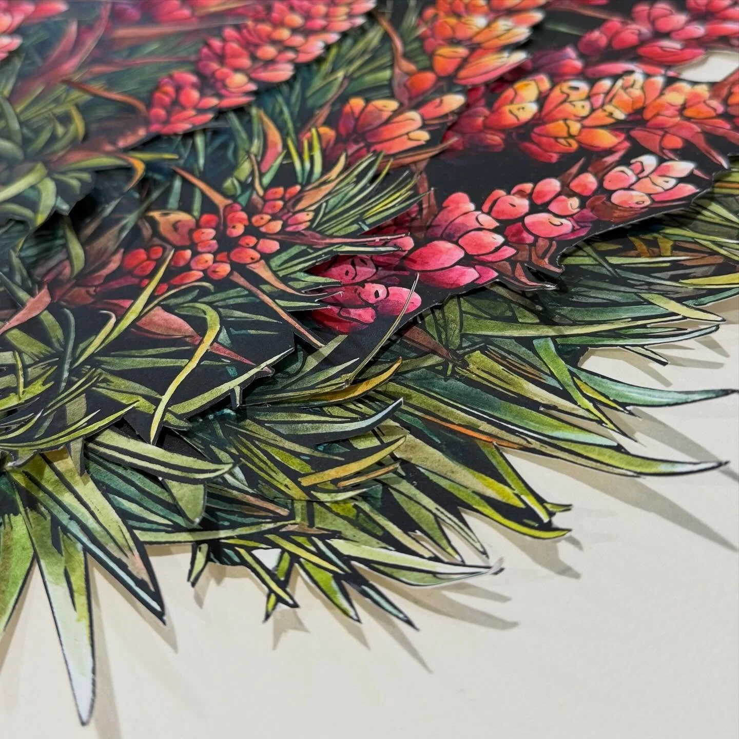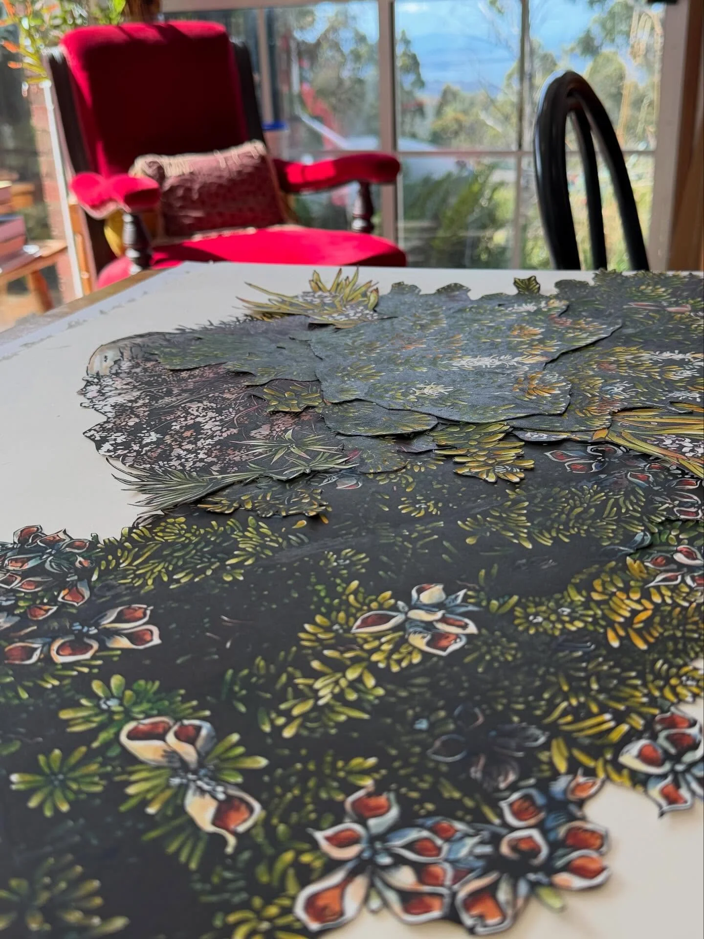 Iām an artist living and working in the foothills of Kunanyi in Lutruwita/Tasmania. I work with linocut, watercolour and collage to explore the landscape and my place in it.