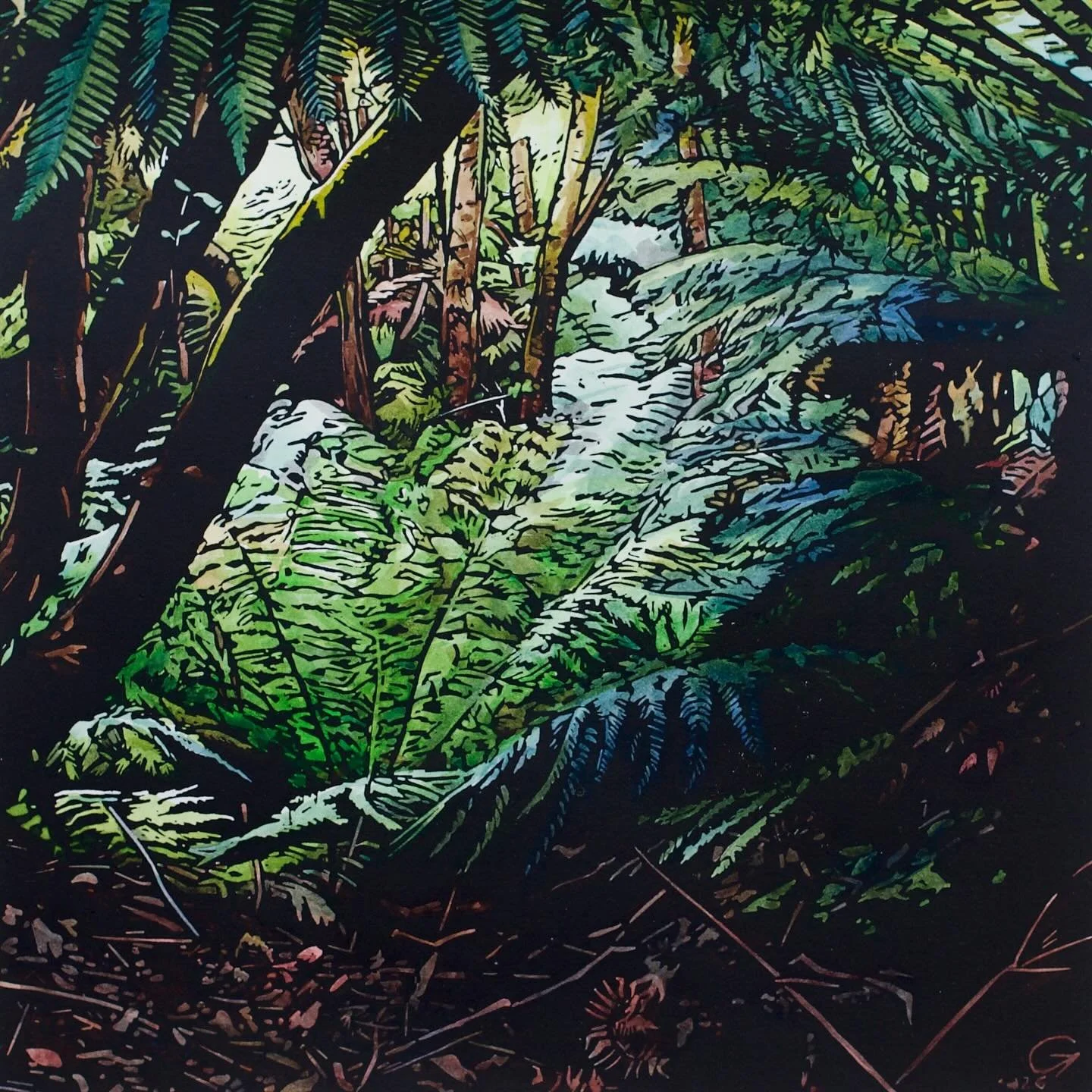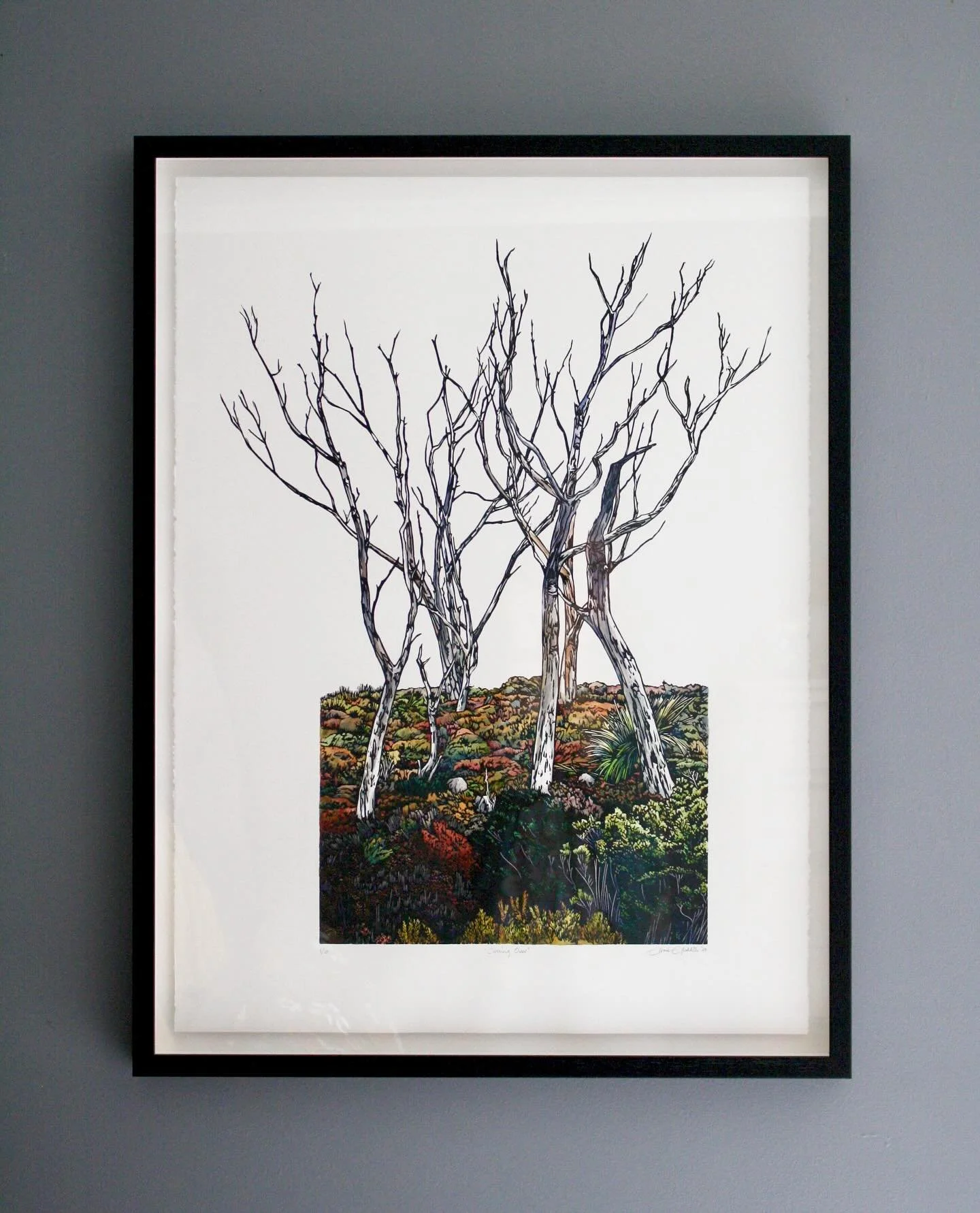 I’m an artist living and working in the foothills of Kunanyi in Lutruwita/Tasmania. I work with linocut, watercolour and collage to explore the landscape and my place in it.