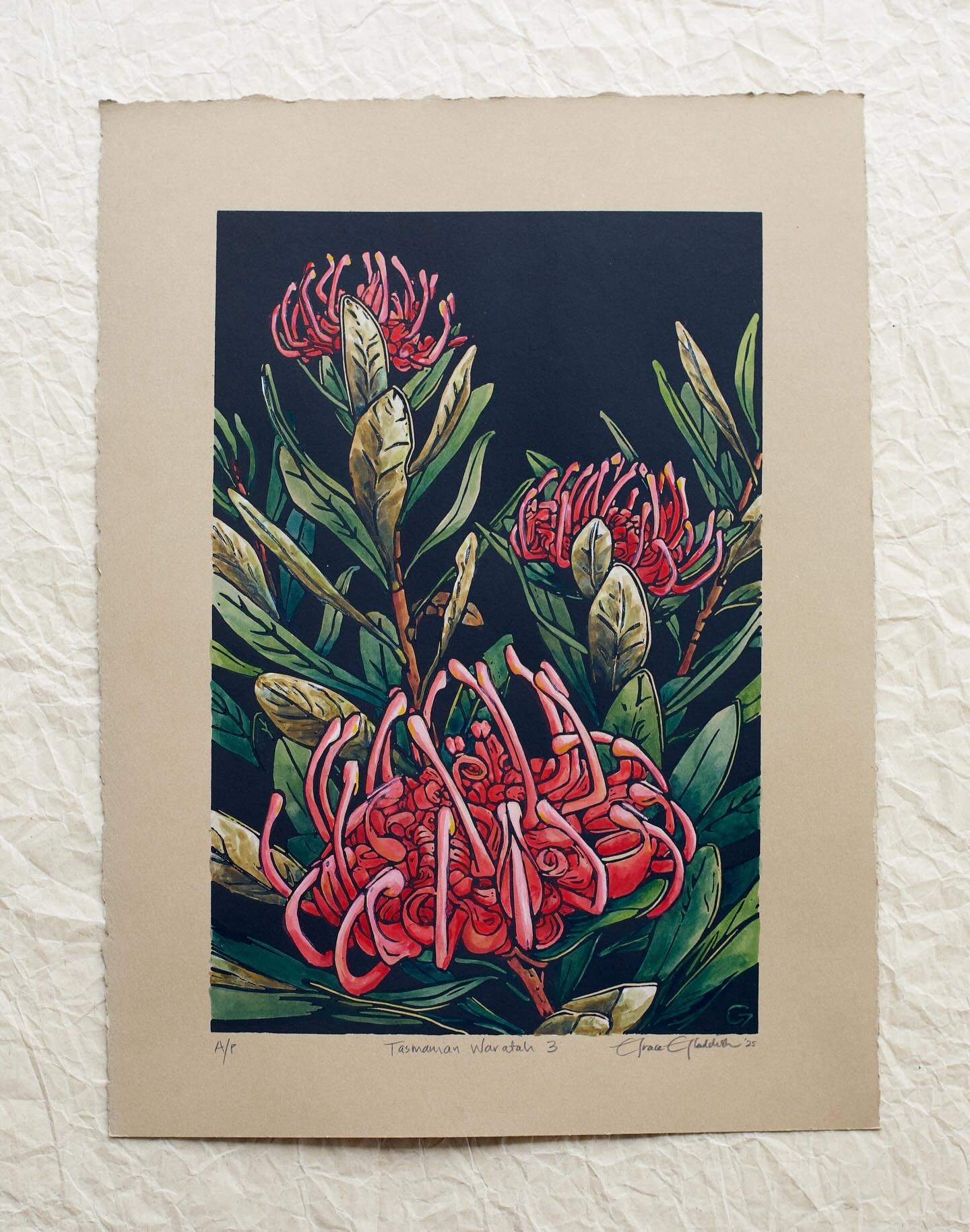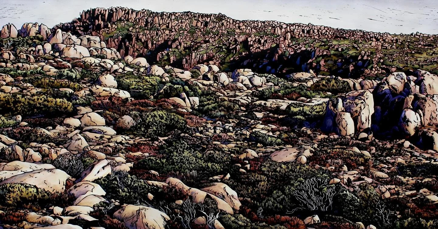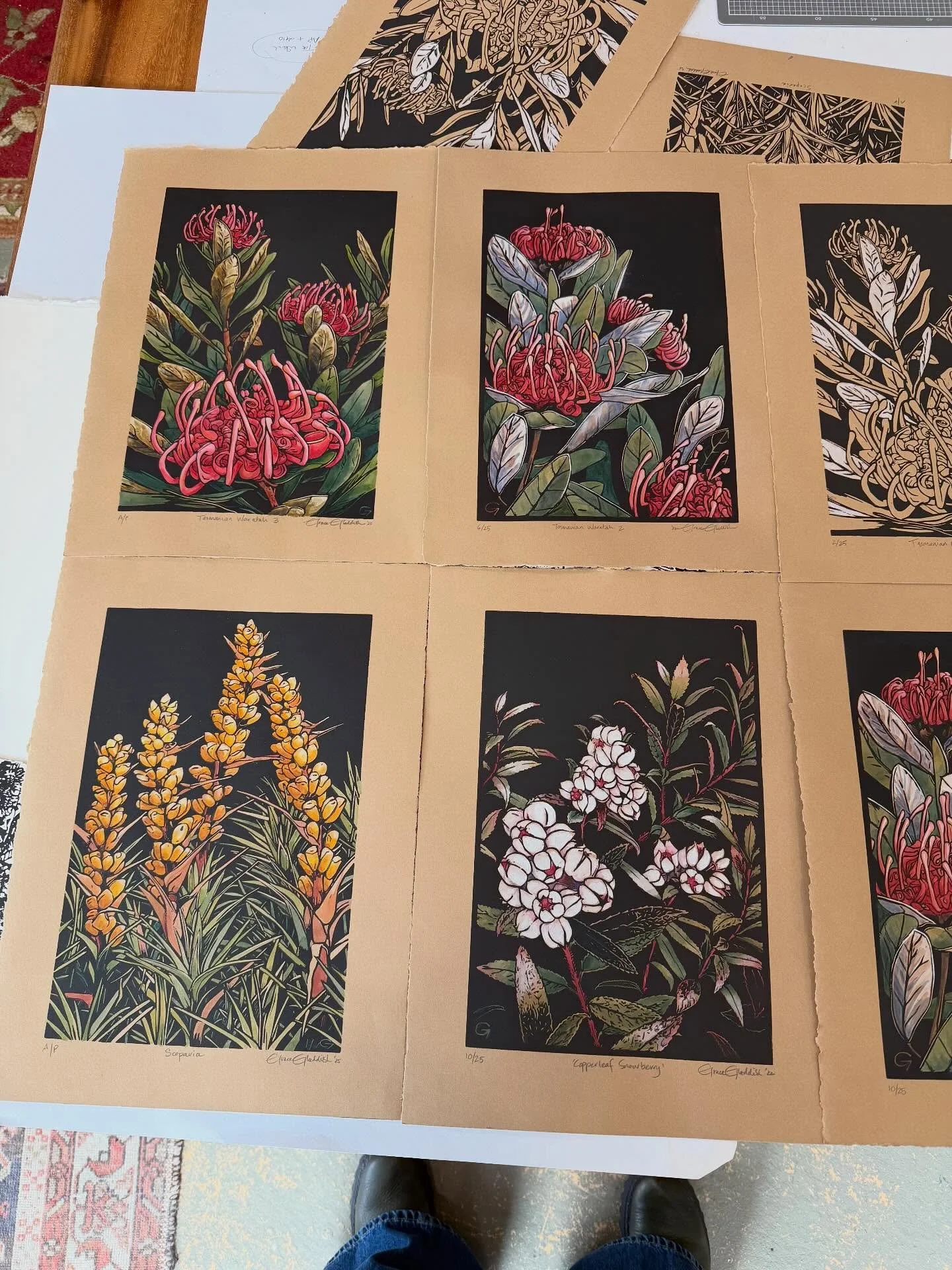 I’m an artist living and working in the foothills of Kunanyi in Lutruwita/Tasmania. I create hand painted relief prints that explore the landscape and my place in it.