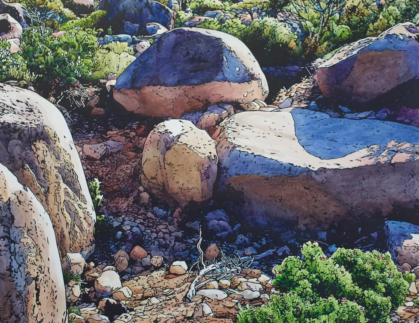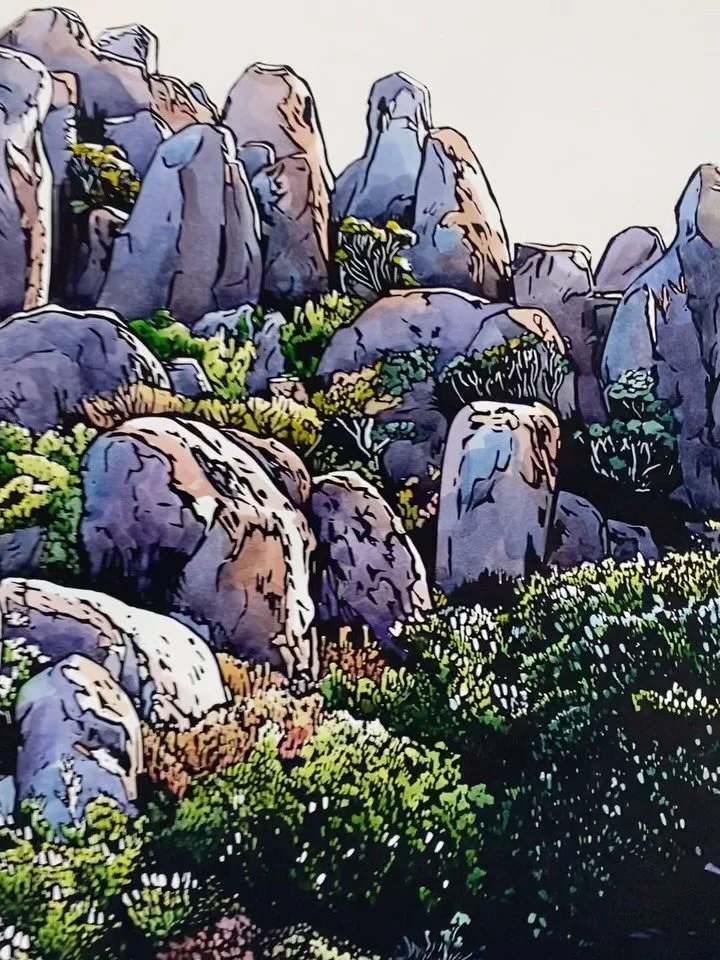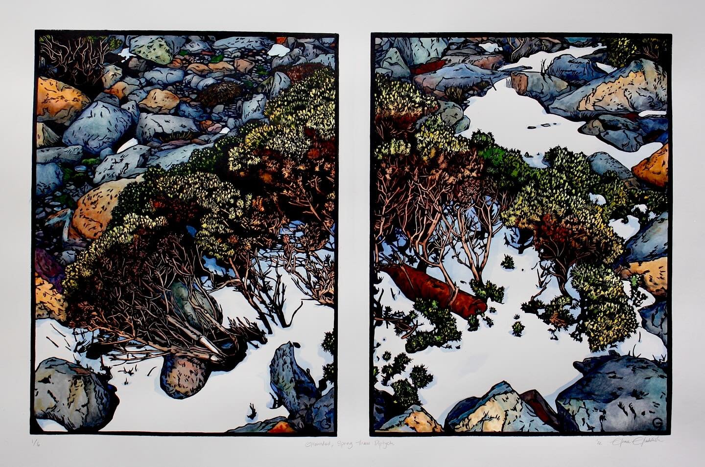 I’m an artist living and working in the foothills of Kunanyi in Lutruwita/Tasmania. I create hand painted relief prints that explore the landscape and my place in it.