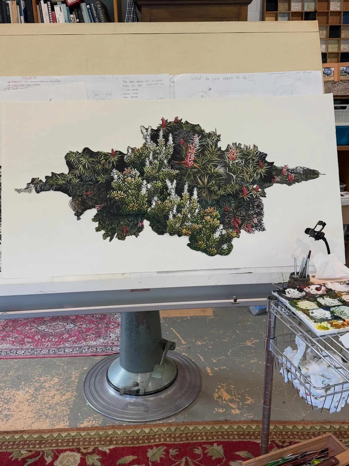 Iām an artist living and working in the foothills of Kunanyi in Lutruwita/Tasmania. I create hand painted relief prints that explore the landscape and my place in it.