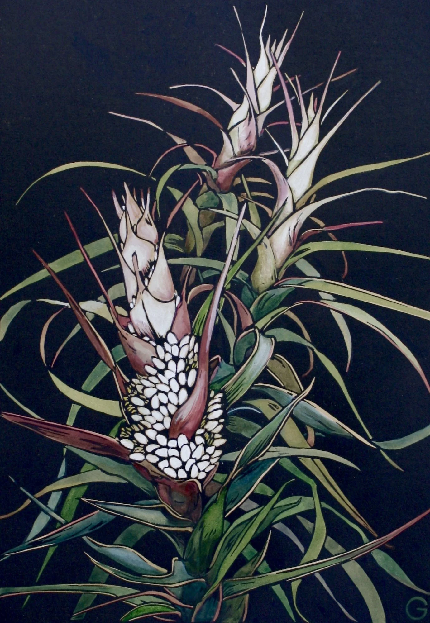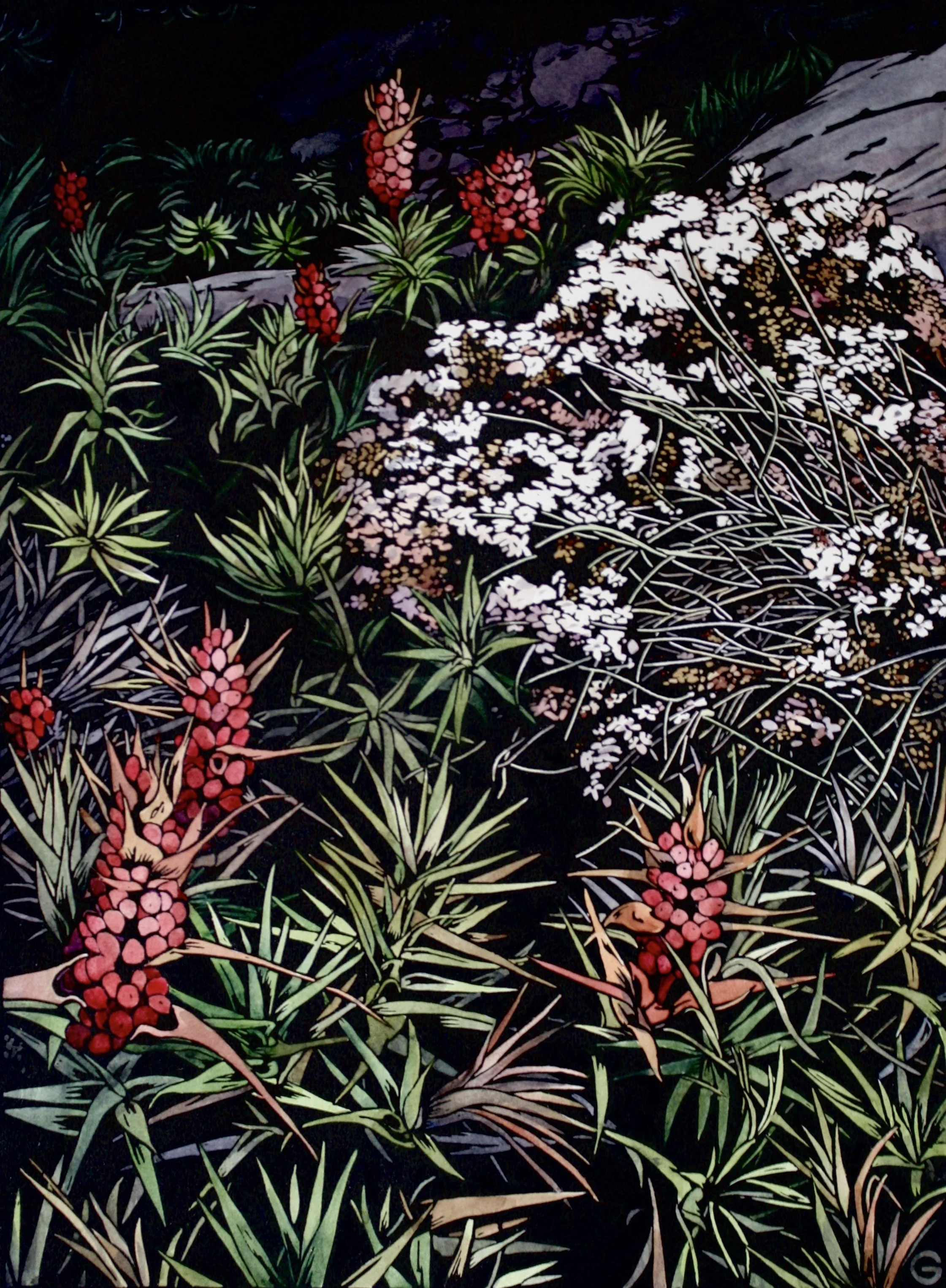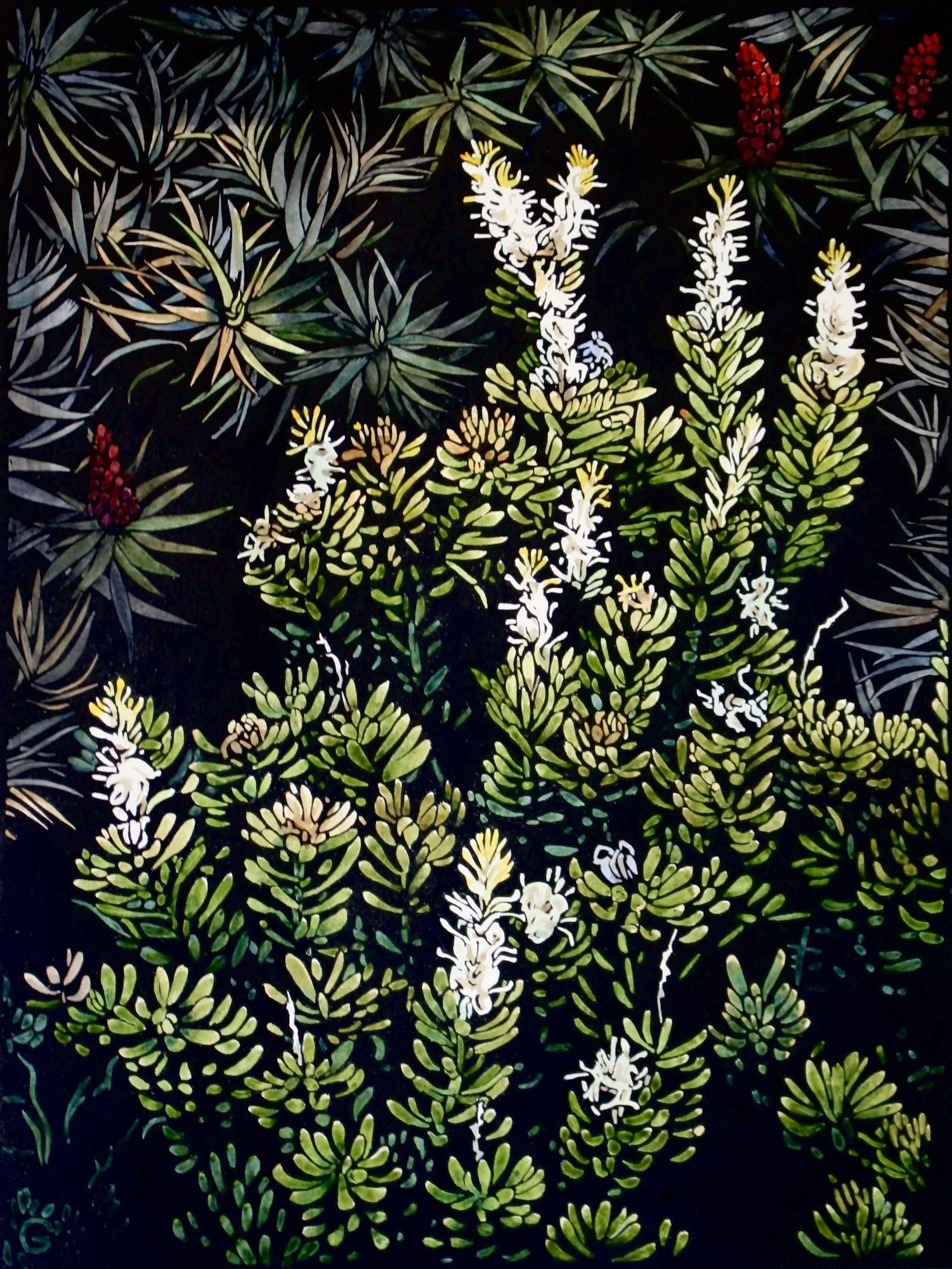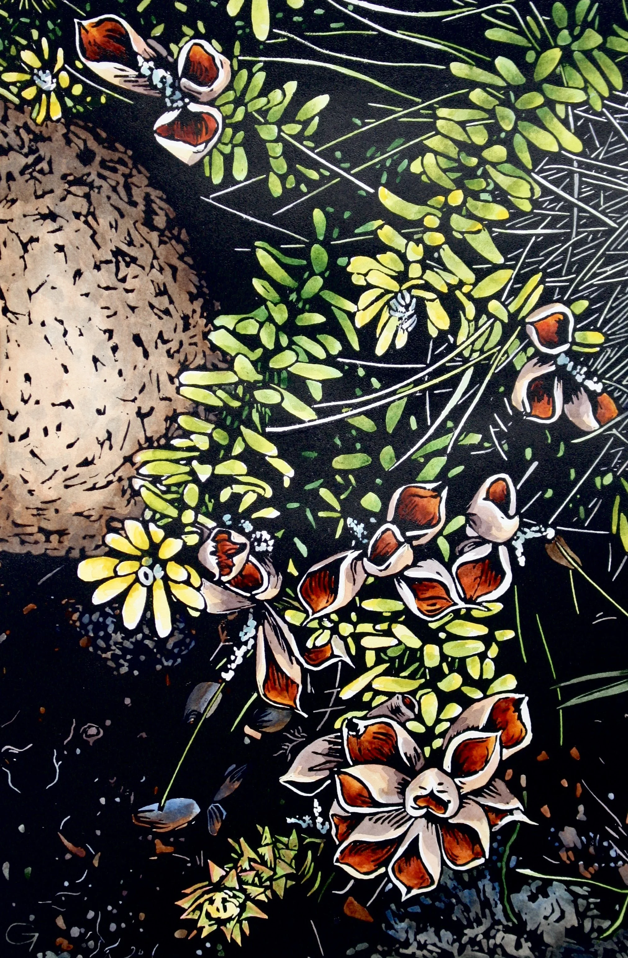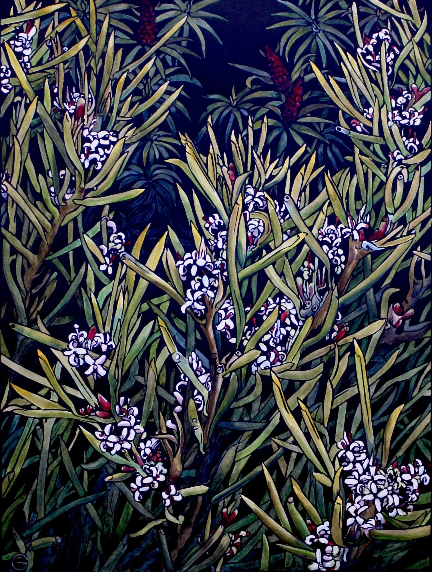 For 10 years, I grew Proteaceae and native flowers for the cut flower market. As a result, I find myself interested in the structure of our native flowers and the plants that produce them. Any time I explore a landscape, the plant-life is an important focus for me. Over the years, I have made many botanical linocuts, some of which are below.