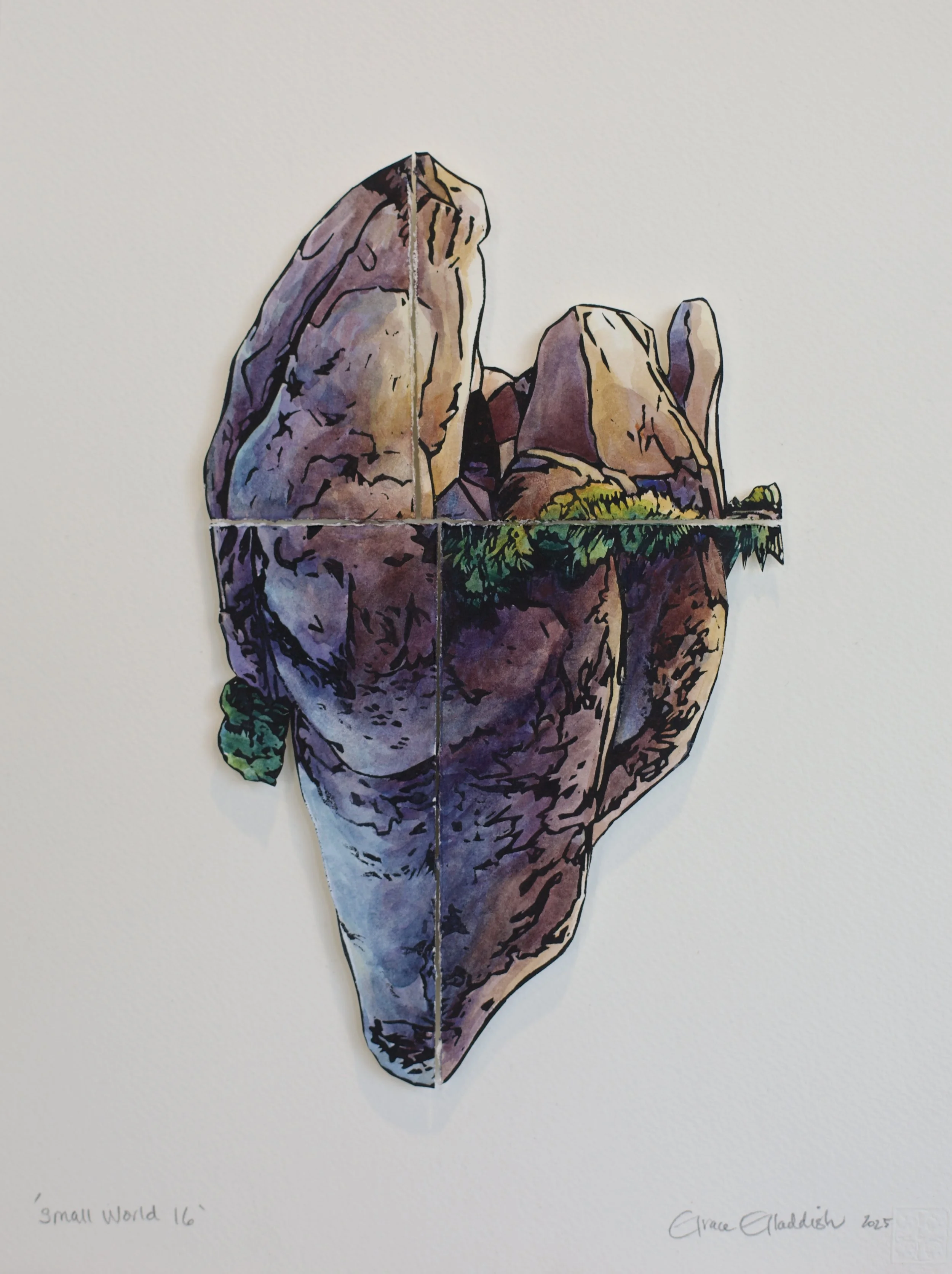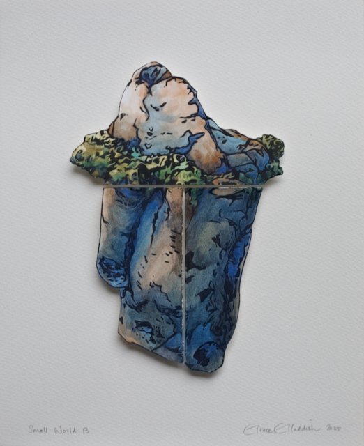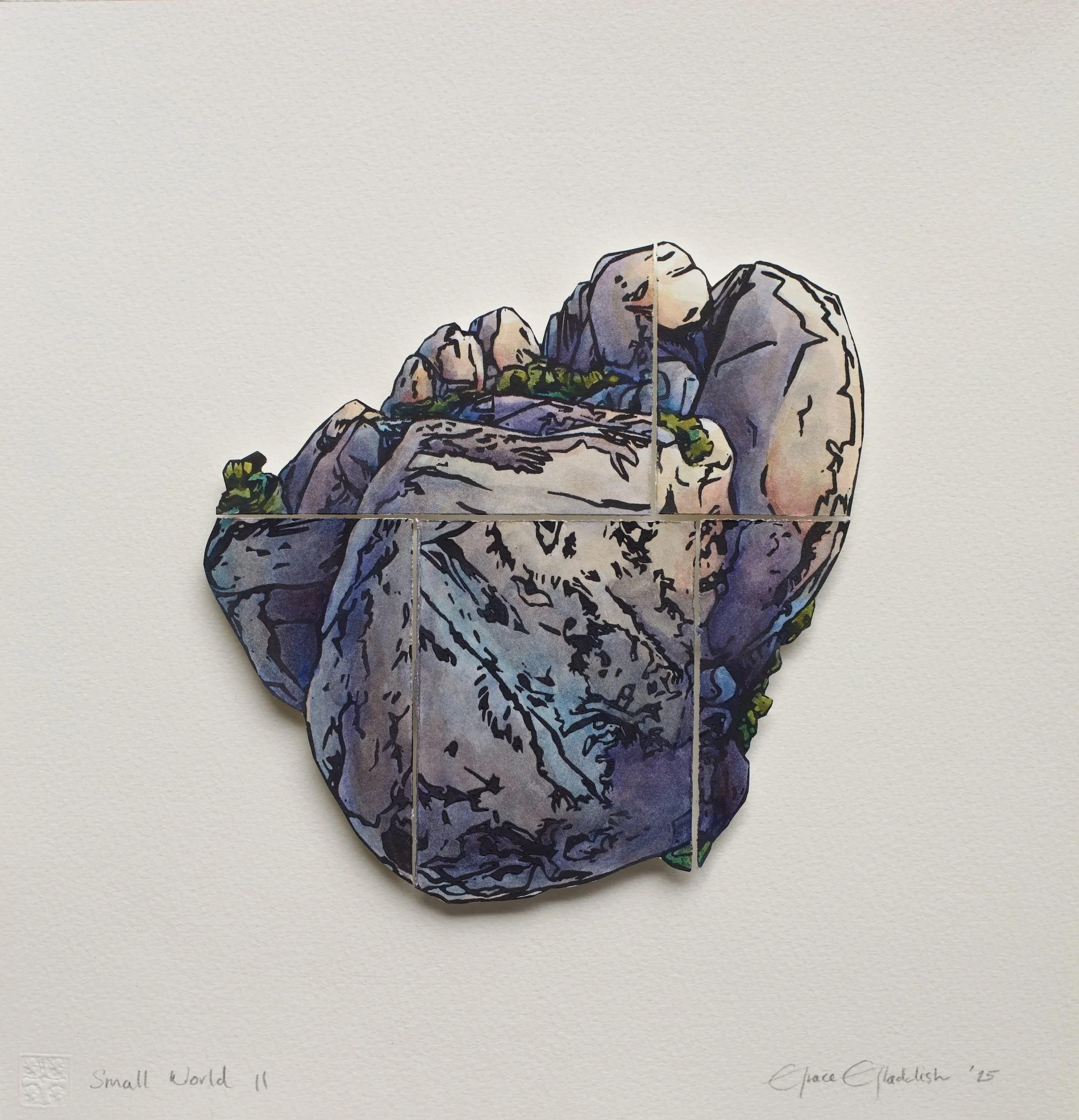 With the small world series I wanted to see how far I could push the collage works. Using the torn edges like latidudinal and longitudinal lines on a map, I found lines and shapes within my linocut prints that seemed to ‘go’ together. The process is meditative, and involves tearing, cutting and moving pieces around until suddenly a new entity seems to appear, almost as if it were always there waiting to be revealed. The worlds seem to have their own characters which suggest colour palettes to me. Once they are securely glued, I paint them with watercolour.