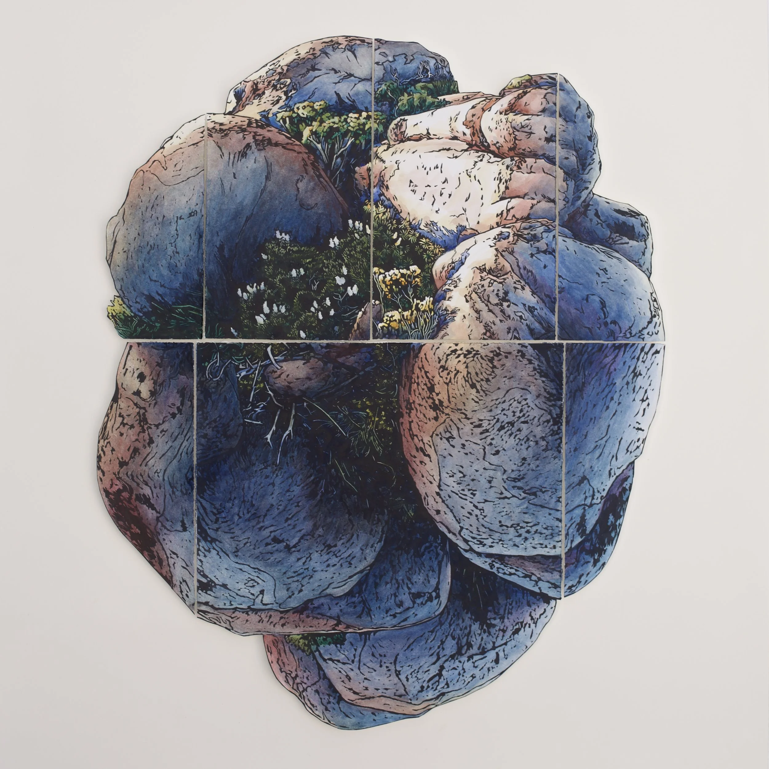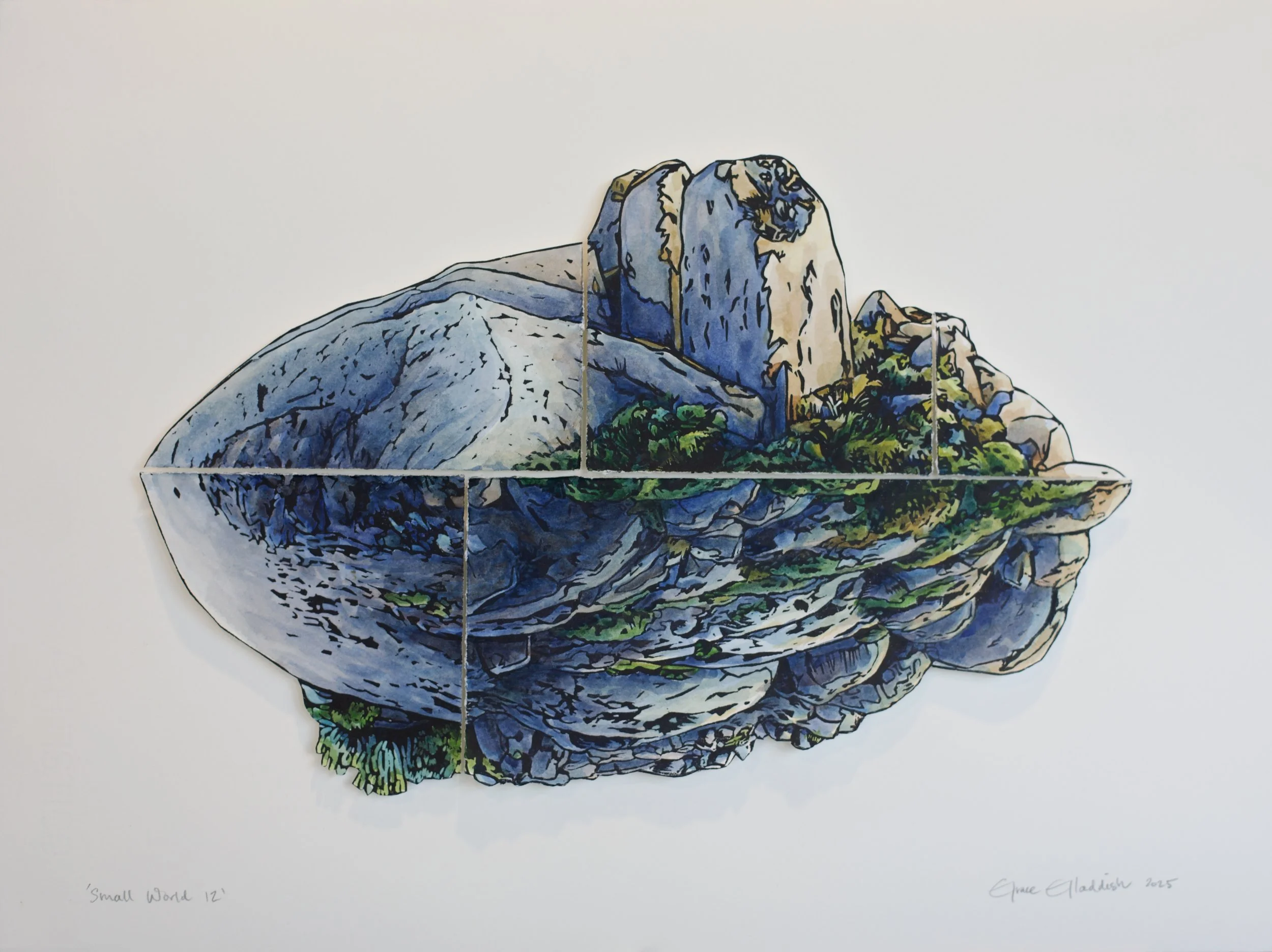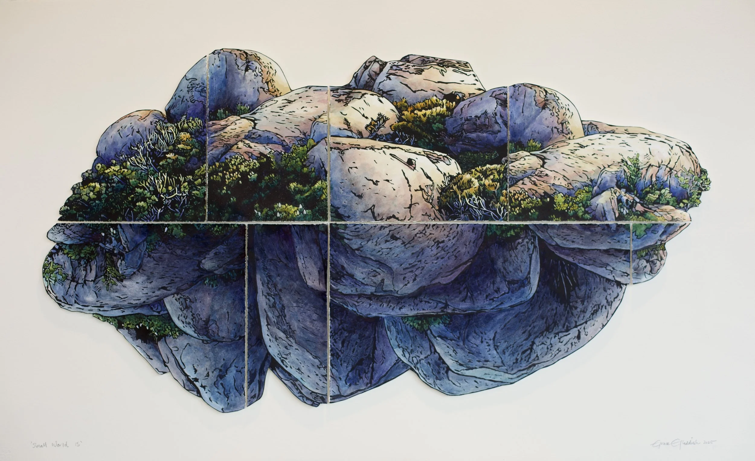 This series began while preparing work for an exhibition at Print Council Gallery with the nowhereprint collective in 2024. The show had the title “Latitude” and I had been thinking about how my practice has always had a ‘mapping’ element running through it. The exhibition called for 2 pieces of artwork to be hung above and below an invisible central line running through the gallery, or a latitudinal line. I created Small World 2 and 3 for that exhibition, but only ended up only exhibiting one of them. But the ideas began to flow, and soon there were many small worlds coming together in the studio. My solo show at Salamanca in 2025, “Elevation”, brought many of them together in a large salon style hang. All different shapes and sizes, they came together as if in a constellation or solar system.
